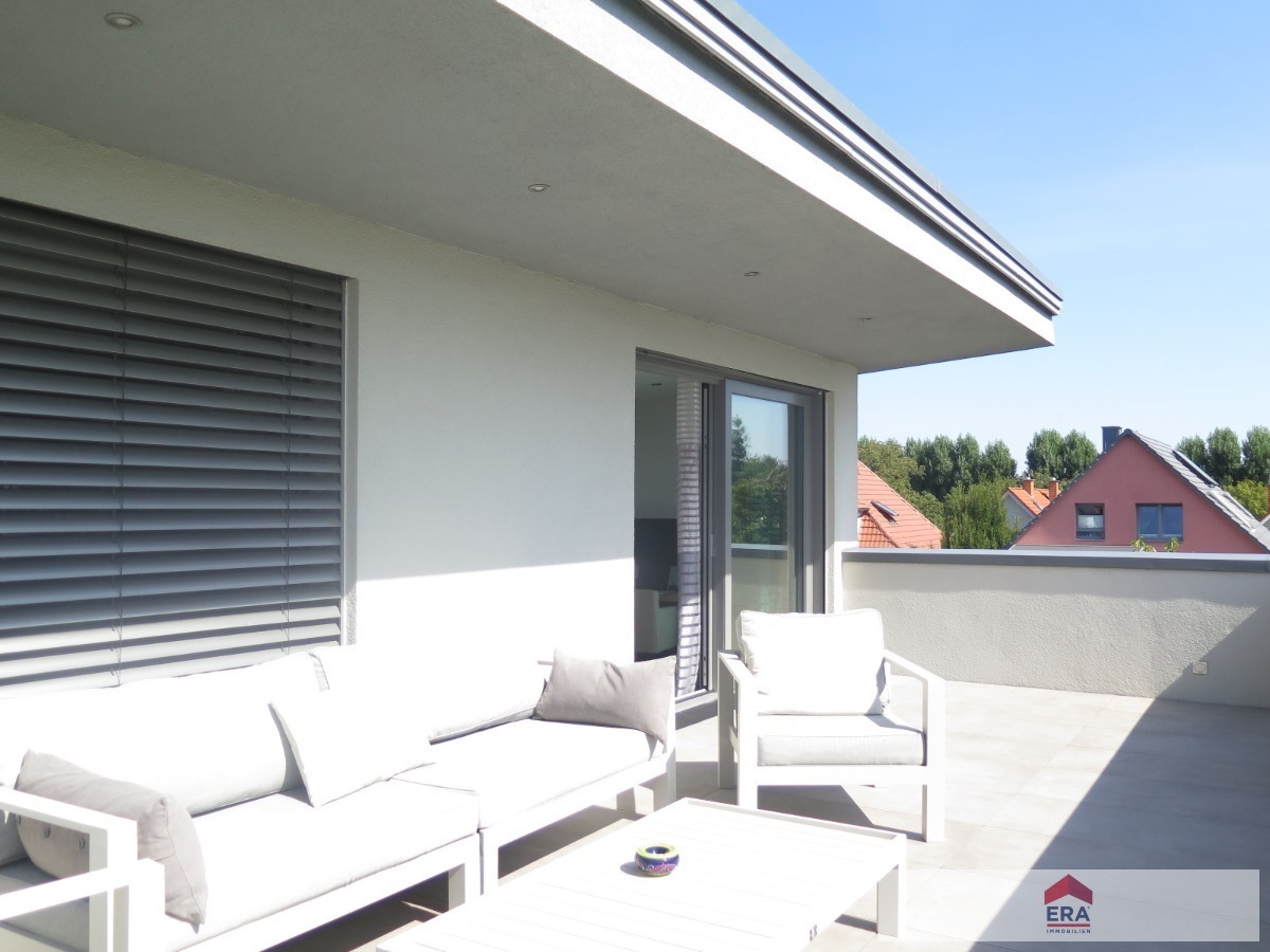 Im Einklang mit der weitläufigen, und schönen Terrasse unterstreicht er das niveauvolle Ambiente des Wohnensembles
